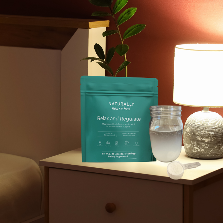 Relax and Regulate offers magnesium combined with an amino acid glycine, providing magnesium bis-glycinate. Glycine works to support neuromuscular relaxation and calming neurotransmitters in your brain, such as GABA, to mellow out your stress response and support balanced circadian rhythm.