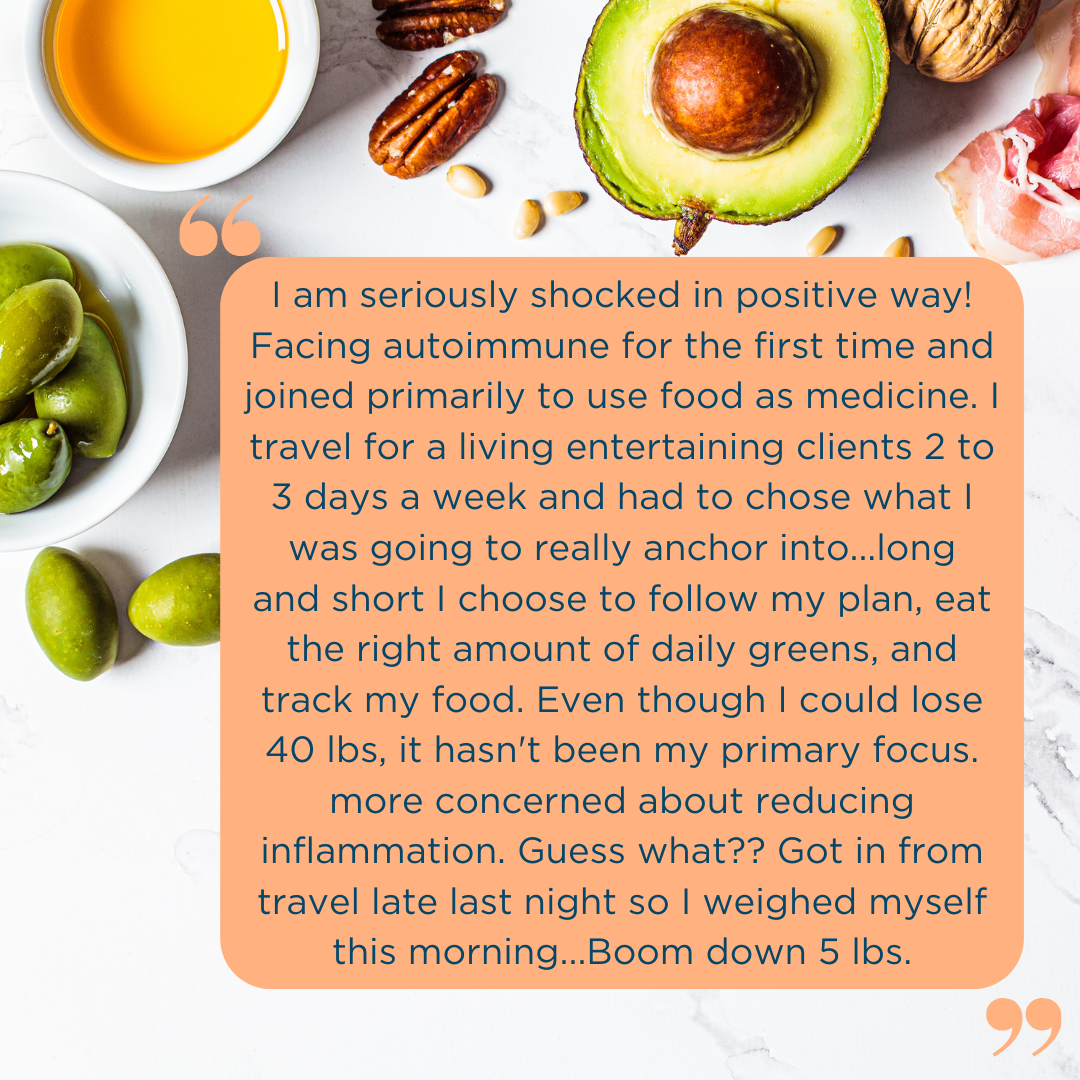 "I will say that adding the calm and clear supplement has been a HUGE mood changer for me! I would have never ordered that but WOW did I need it!!!! Changing my mindset from what I can’t have to thinking about food as fuel and healing to my body has made a big difference for me!"