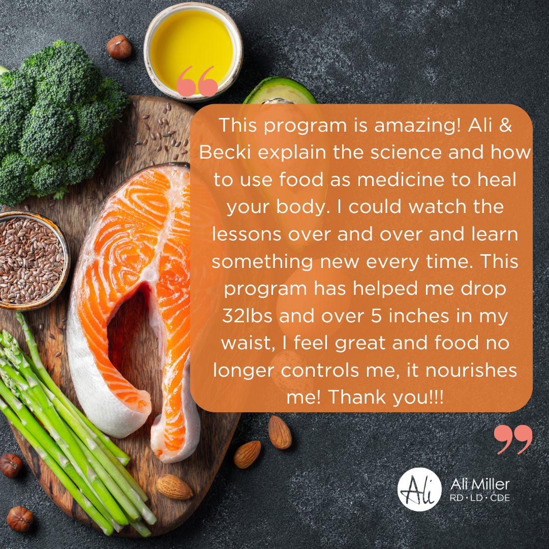"The course was great and I felt really empowered! I appreciated the practical attitude about eating and the realistic approach (ie there's a good chance you'll 'fall off the wagon' at some point, but don't allow that to derail you mentally or otherwise). I really appreciated that Ali shared the science and empirical evidence for her program, even though it was challenging. I really appreciated the support of the FB group and knowing that I could get questions answered quickly by Ali and Becki through that forum."