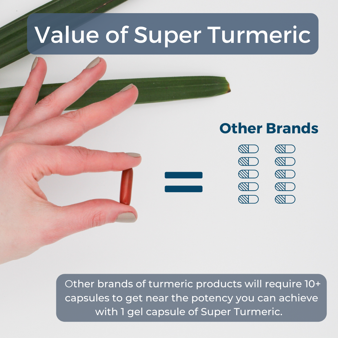 When looking at a label, many manufacturers only denote the total weight from turmeric and do not establish dosage or potency of the curcuminoids. This means most other brands of turmeric products will require 10+ capsules to get near the potency you can achieve with 1 gel capsule of Super Turmeric.